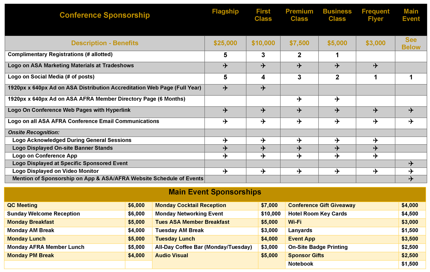 ASA AFRA 2025 continues to attract new and returning attendees from the distribution, disassembly, and recycling communities and provides the perfect setting for building relationships, generating new business, and expanding knowledge and growth opportunities. Past conferences have welcomed nearly 300 senior-level industry representatives from 11 countries. Attendees gained access to 10 sponsored networking events, 16 Workshops, and 2 information-packed general sessions, which included expert panels and industry insight for future planning. The Marketplace highlights many of the industry's service providers, offering services from the distribution, technology, disassembly, and recycling sectors. There is no better way to reach key decision-makers in an intimate and dynamic environment while offering you great visibility within the aviation distribution, disassembly, and recycling communities. Sponsoring the ASA AFRA Annual Conference brands your company as an industry leader.