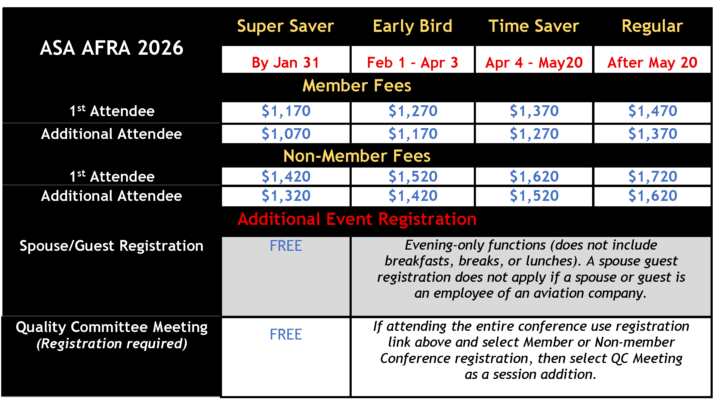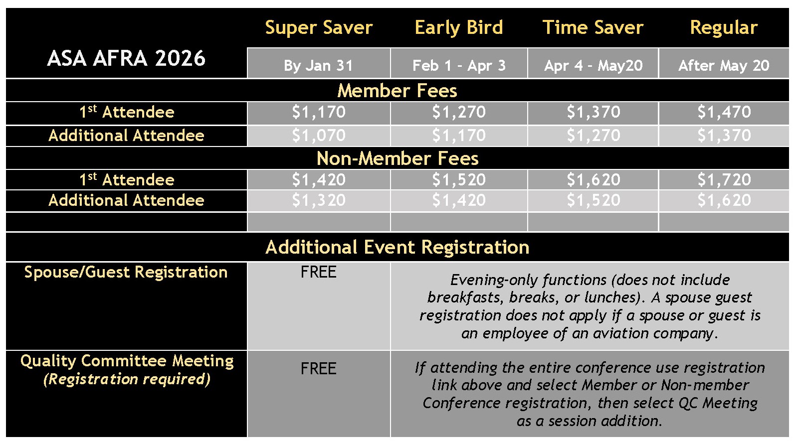 Registration for the ASA AFRA 2026 Conference includes access to all educational events, all meal functions (except Members Only functions like AFRA Member Lunch and ASA Member Breakfast, all networking events, as well as all conference materials, presentations, and additional items.